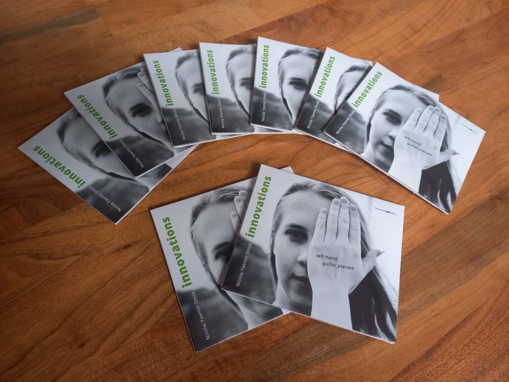 While Nicola Yasmin Stock had been suffering from epicondylitis in her right arm, she came up with the thought of playing the guitar with her left hand only. Unfortunately, there were only a few pieces existing that can be played without the right hand. Since the piano world has already gathered many great pieces for left hand only by well-known composers such as Scriabin or Ravel, she thought that the guitar repertoire should get some more, too – that was how the project began.